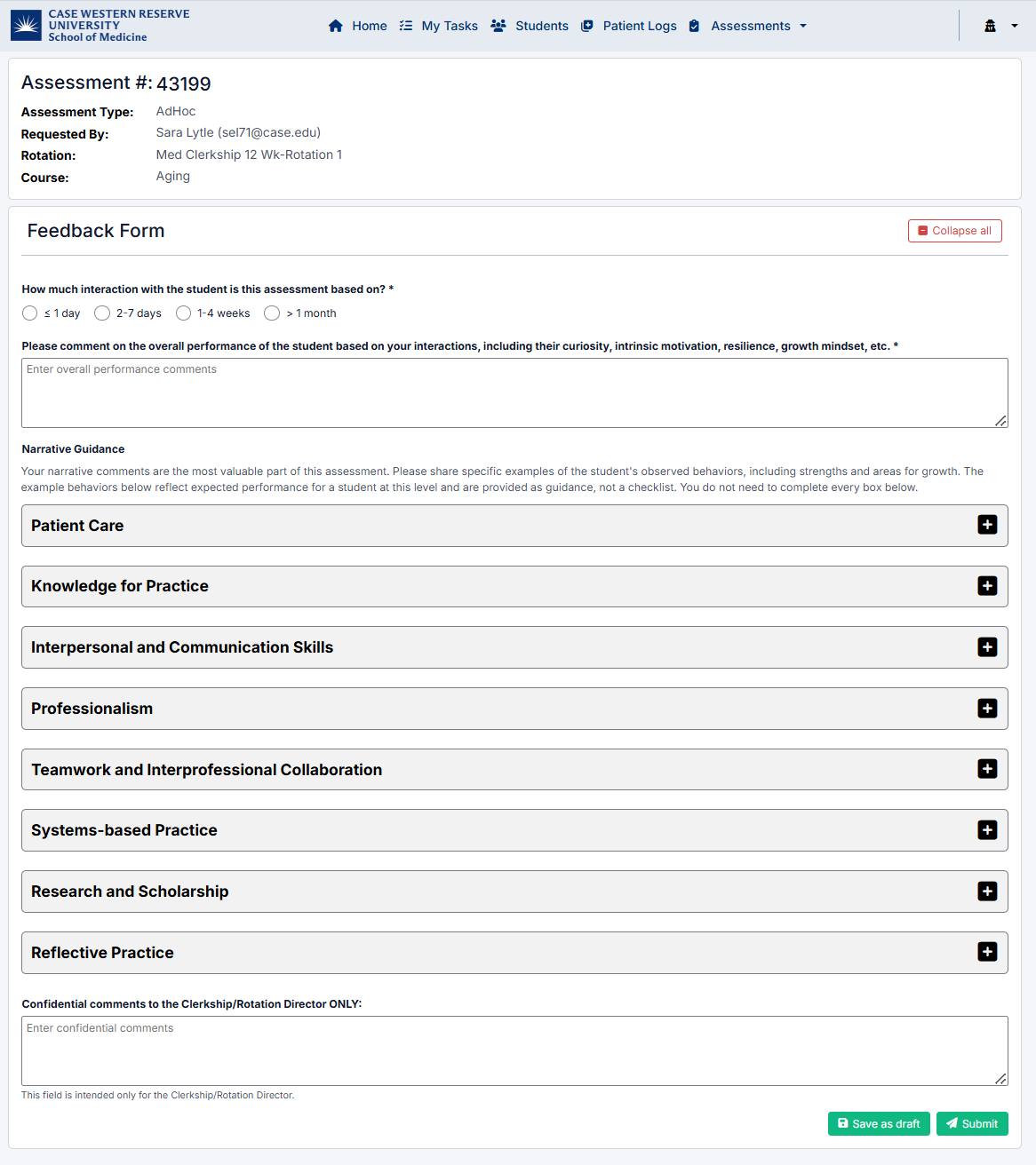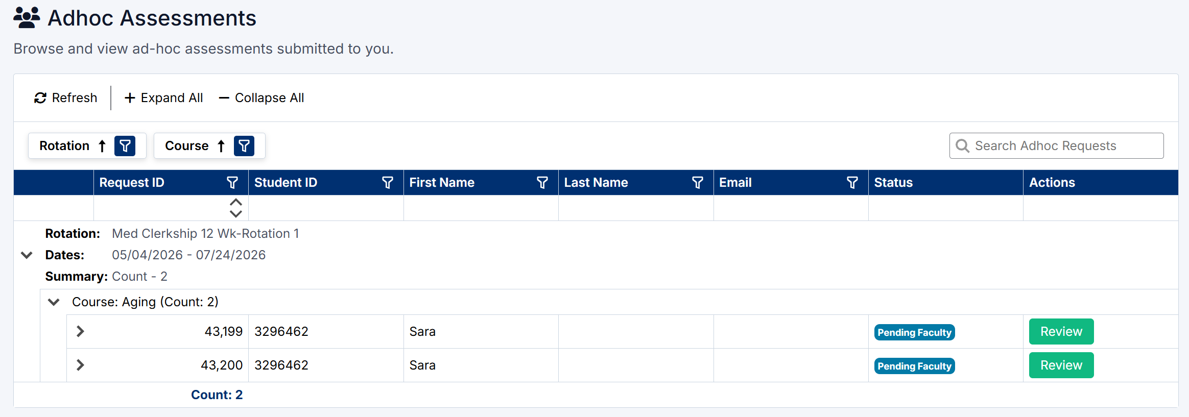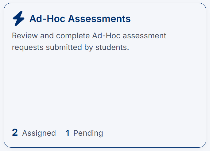 The Ad-Hoc Assessments page allows you to review and complete assessment requests submitted by students for specific clinical encounters.