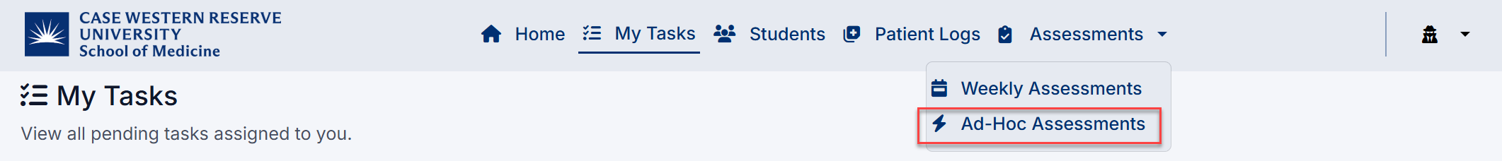 The Ad-Hoc Assessments page allows you to provide timely, encounter-based feedback, supporting accurate evaluation of student performance in real clinical settings.