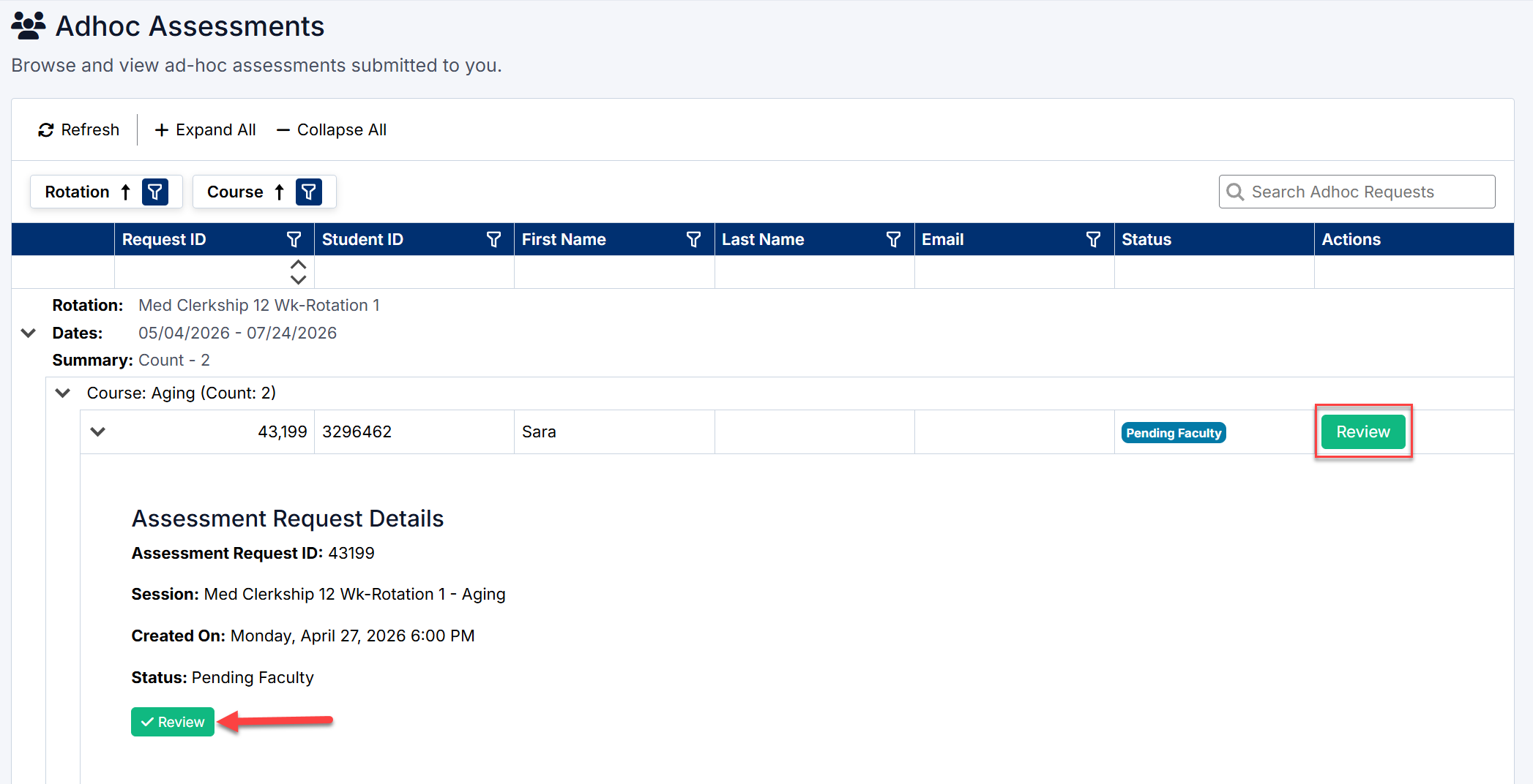 - Assessment status (e.g., Pending Faculty)