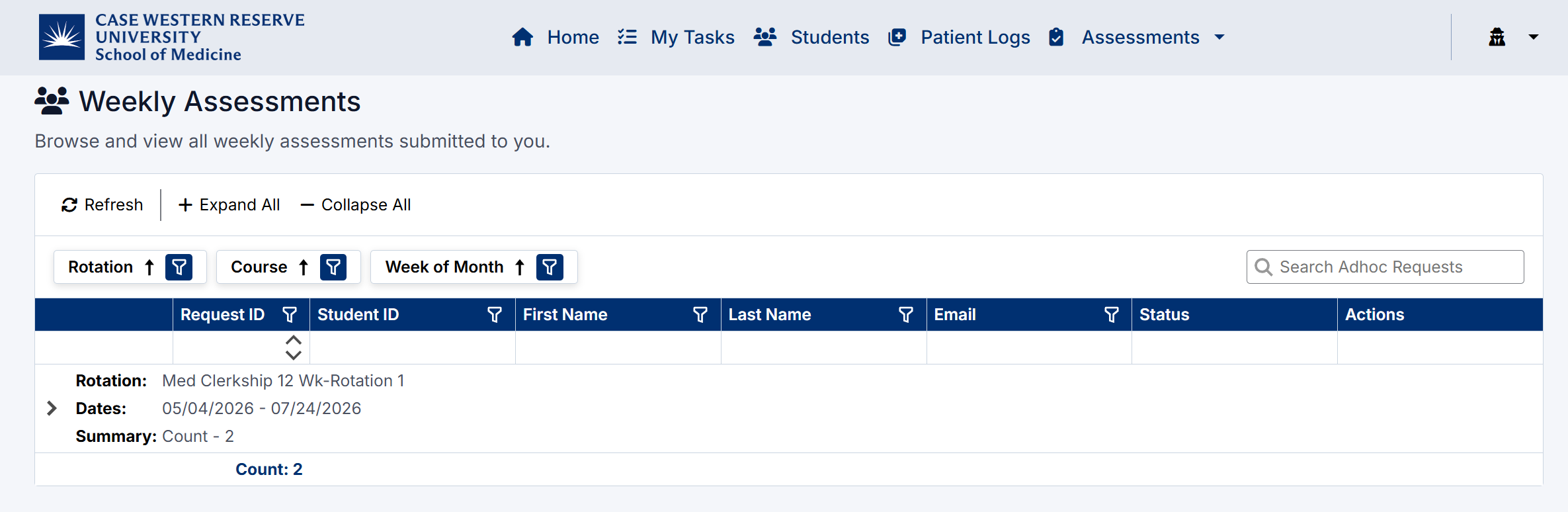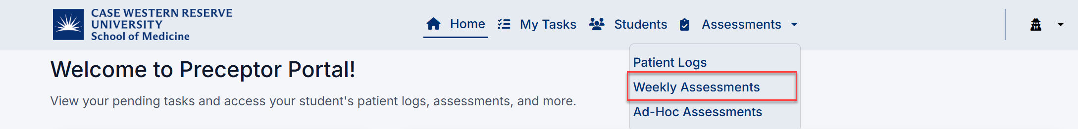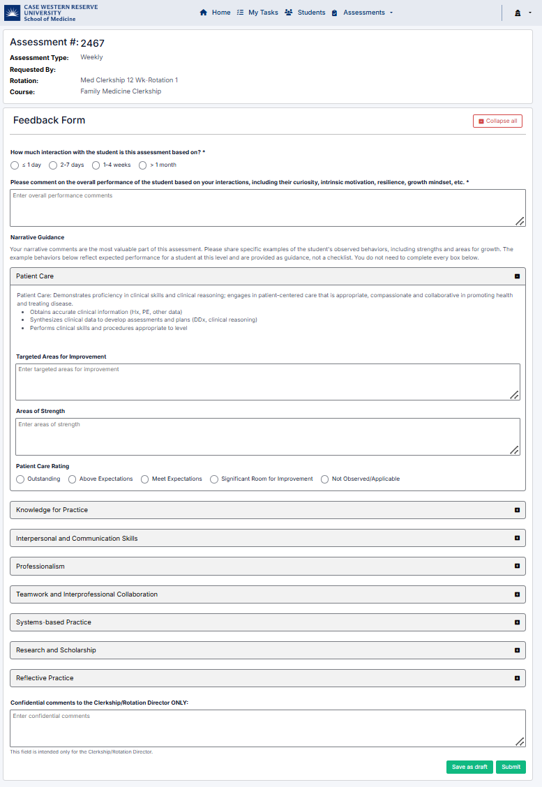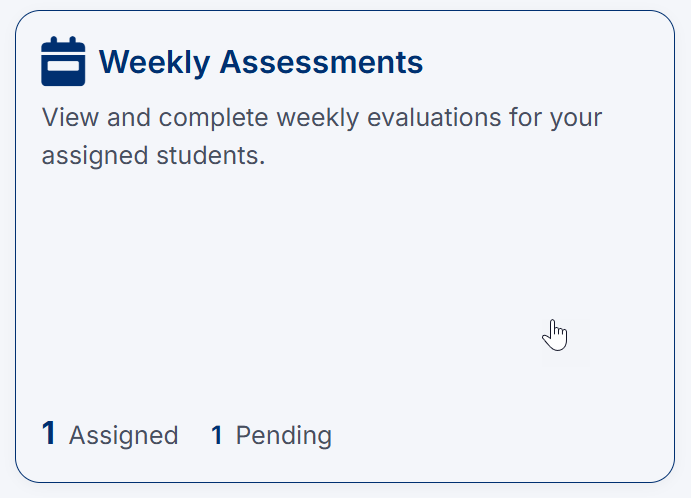 The Weekly Assessments page allows you to view and complete weekly evaluations for students assigned to you. These assessments provide ongoing feedback based on your interactions with students during each rotation.