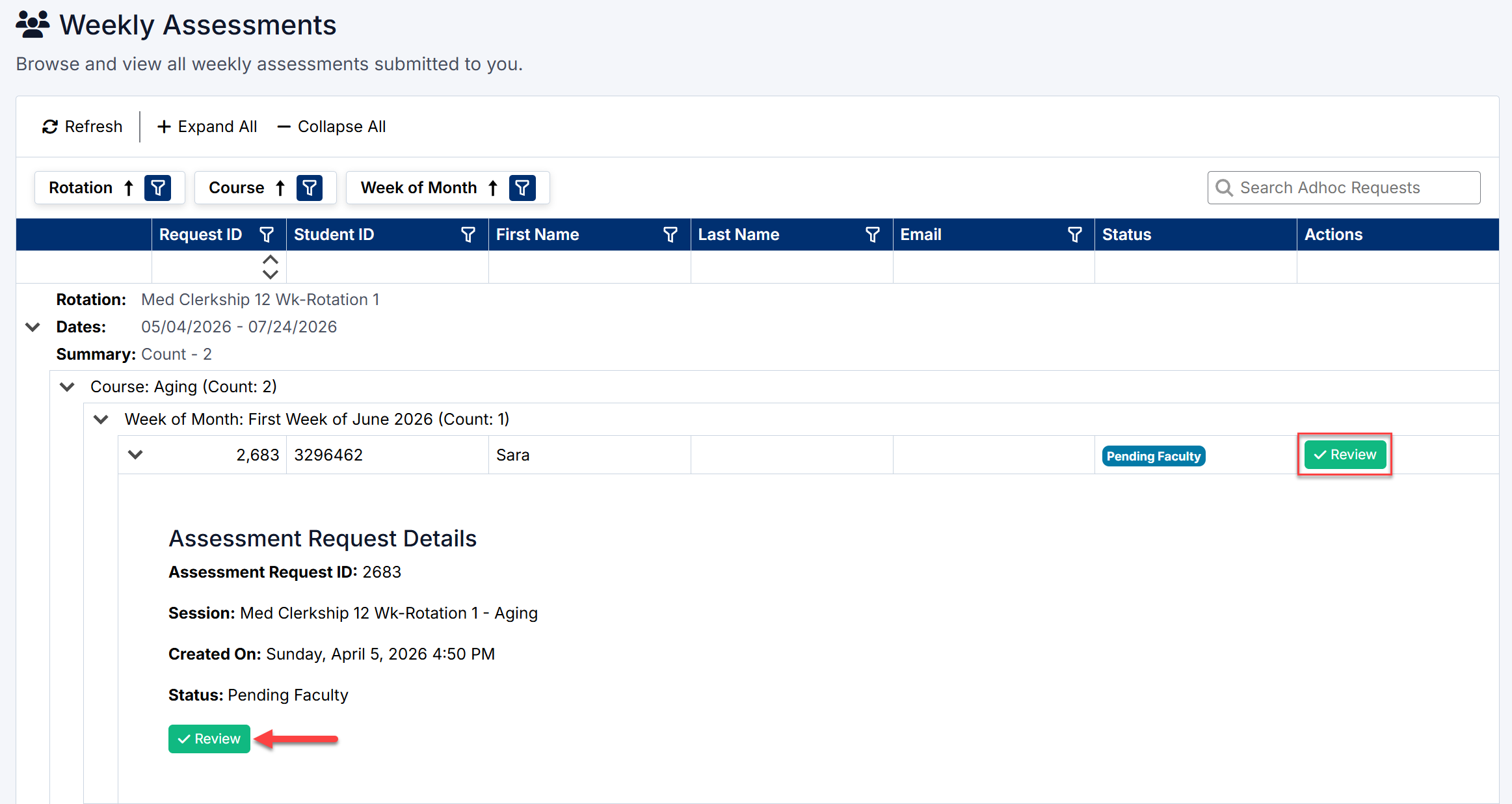 • Assessment status (e.g., Pending Faculty)