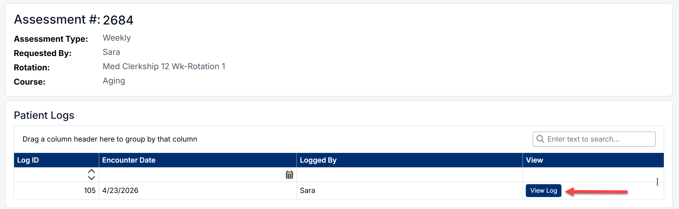 Each weekly assessment may include one or more patient logs that the student has selected to support their request.